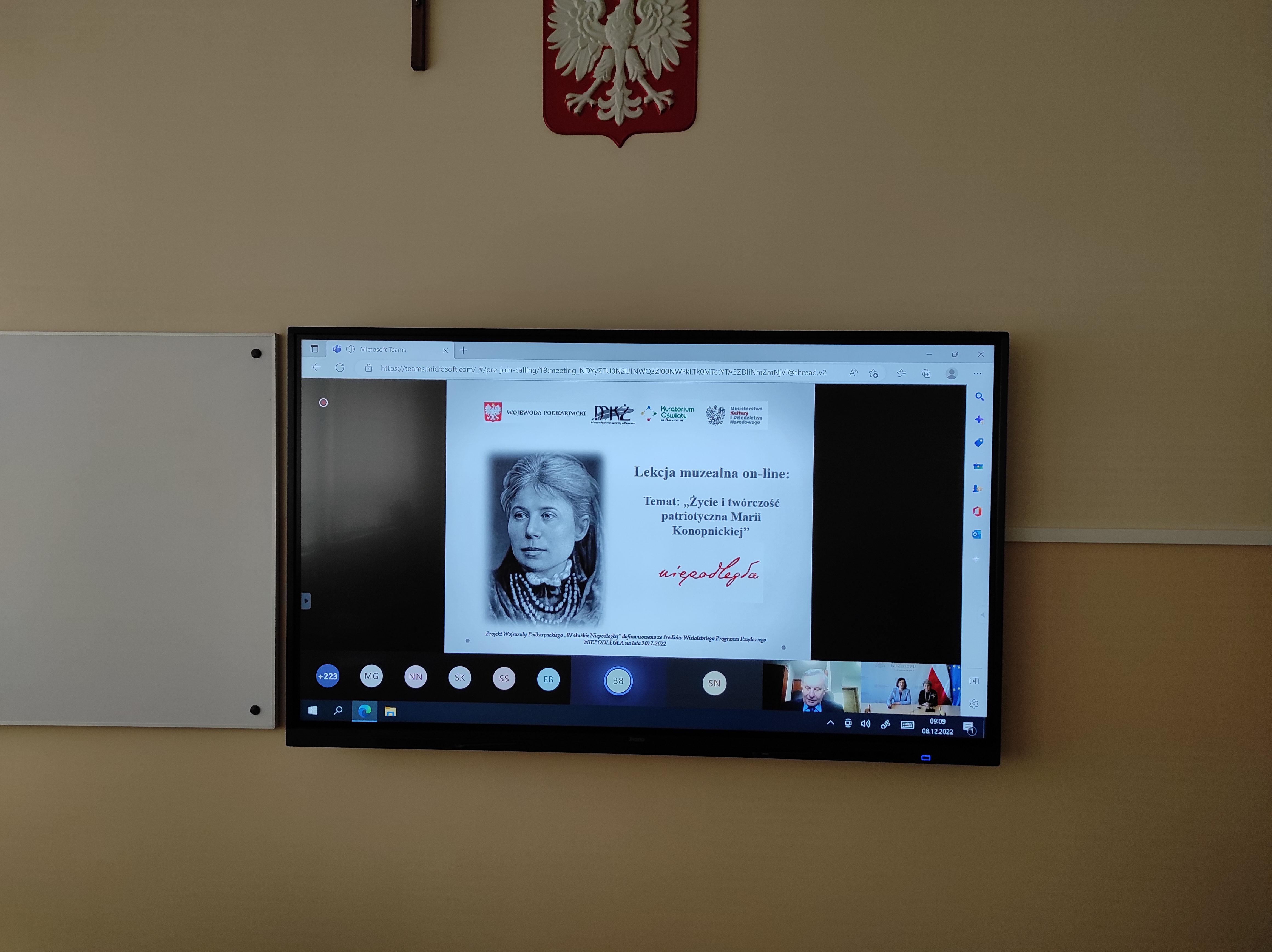 Z okazji 180. rocznicy urodzin Marii Konopnickiej, Sejm Rzeczypospolitej Polskiej ustanowił rok 2022 rokiem Jej imienia. Z tej okazji właśnie uczestniczymy w formie wykładu i prezentacji multimedialnej on-line, transmitowanej za pośrednictwem platformy Teams, prowadzonej przez Pana Pawła Bukowskiego Dyrektora Muzeum Marii Konopnickiej w Żarnowcu. Celem lekcji jest przedstawienie postaci Marii Konopnickiej, której twórczość wyrastała w specyficznej sytuacji zaborów, w atmosferze przygnębienia wywołanej upadkiem powstania styczniowego i ideałów romantycznych. Lekcja zakłada również omówienie twórczości Konopnickiej w obszarze poezji, nowelistyki, utworów dla dzieci, krytyki literackiej, publicystyki i przekładów) oraz jej działalności oświatowej w zakresie nauczania młodzieży i zdobycia przez nich wykształcenia.