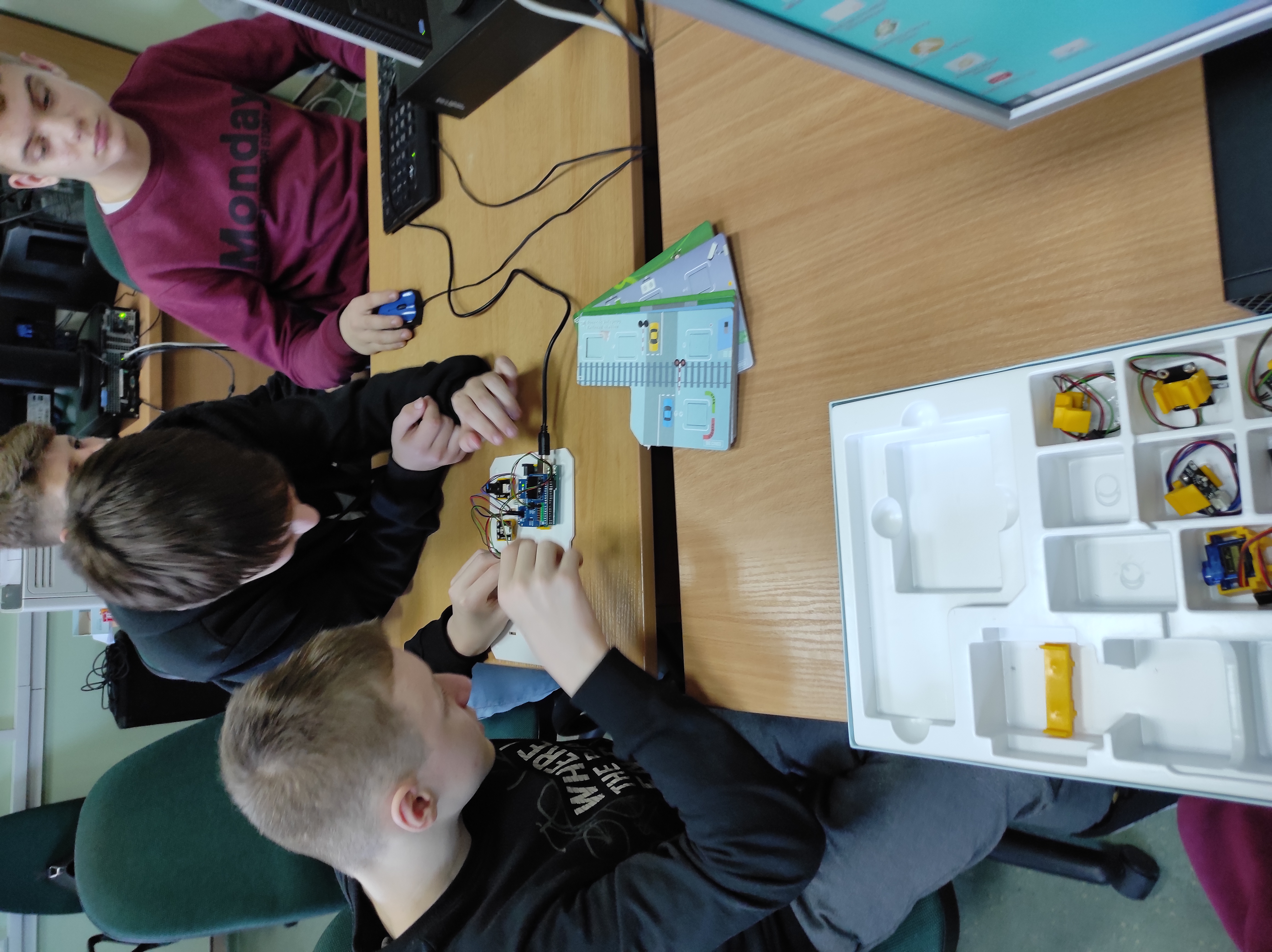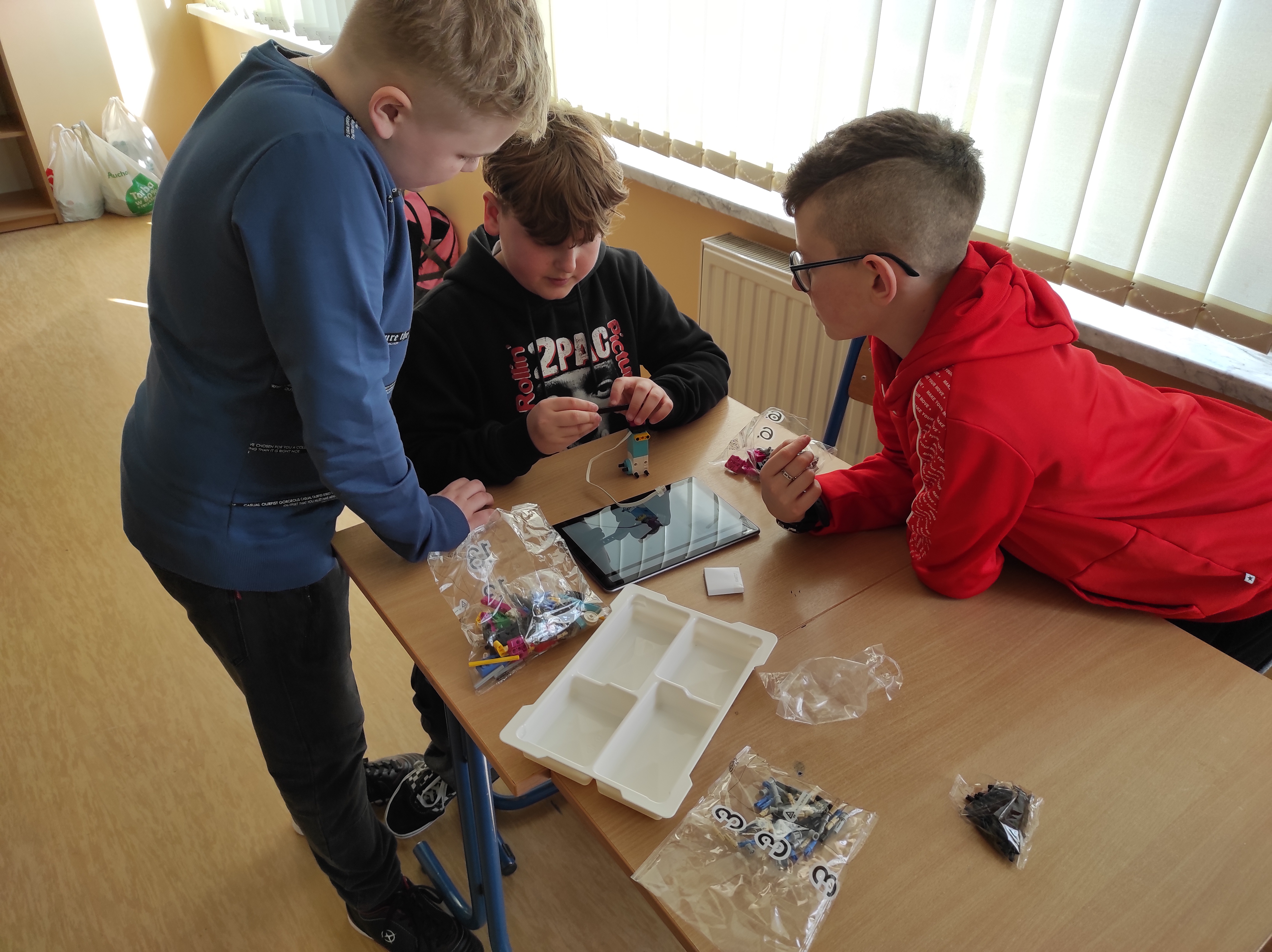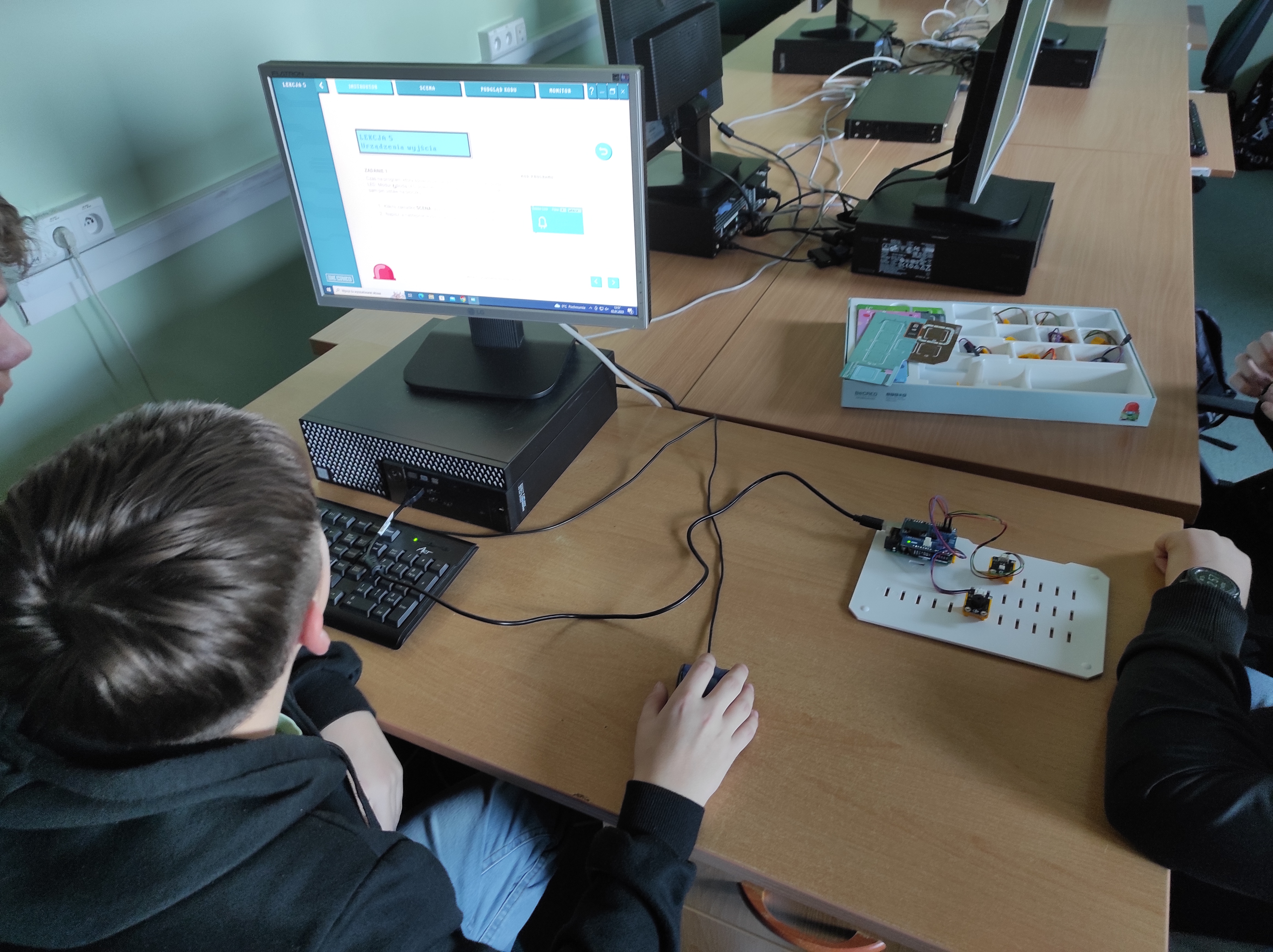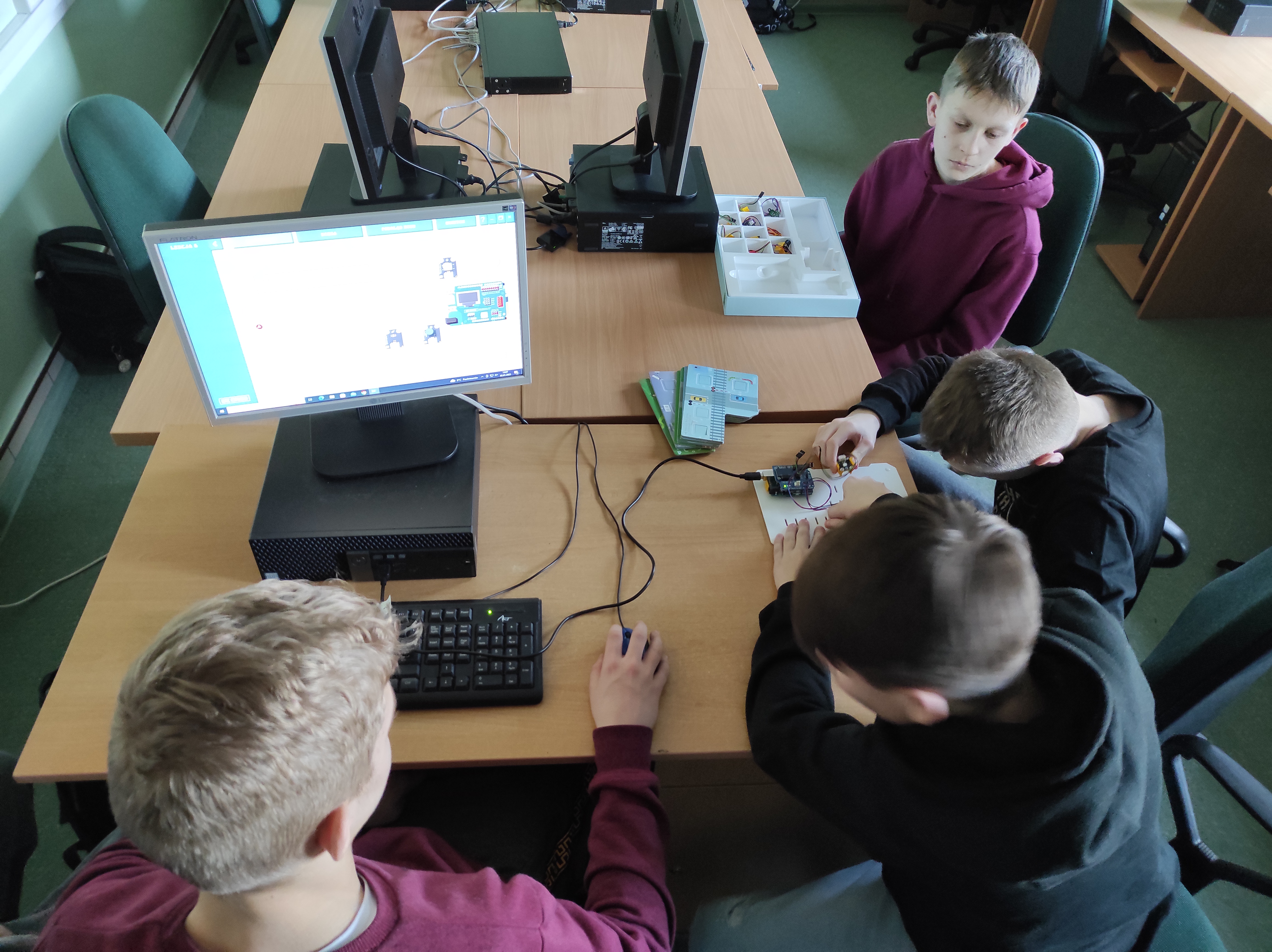 Dziś na zajęciach z programowania chłopcy z klasy szóstej wykorzystali sprzęt BeCreo – zestaw z mikrokontrolerem, który otrzymaliśmy w ramach projektu Laboratoria przyszłości. Laboratoria Przyszłości to inicjatywa edukacyjna realizowana przez Ministerstwo Edukacji i Nauki we współpracy z Centrum GovTech w Kancelarii Prezesa Rady Ministrów. Misją jest stworzenie nowoczesnej szkoły, w której zajęcia będą prowadzone w sposób ciekawy, angażujący uczniów oraz sprzyjający odkrywaniu ich talentów i rozwijaniu zainteresowań. Uczniowie rozpoczęli swoją przygodę z konstruowaniem i mechatroniką, połączyli ze wcześniejszą wiedzą zdobytą na lekcjach programowania, które już od kilku lat prowadzone są w naszej szkole przez Sławomira Króla – nauczyciela matematyki, informatyki – propagującego nauczanie programowania w naszej szkole. Na początku wybraliśmy projekt, wybraliśmy potrzebne moduły elektroniczne i czujniki, podłączyliśmy moduły, aby zbudować system rozwiązujący zadanie. Następnie napisaliśmy program, który kontrolował podłączone moduły i na koniec zostało wysłanie programu do mikrokontrolera i sprawdziliśmy, czy nasz projekt działa. Relacja z dzisiejszych zajęć na zdjęciach poniżej.