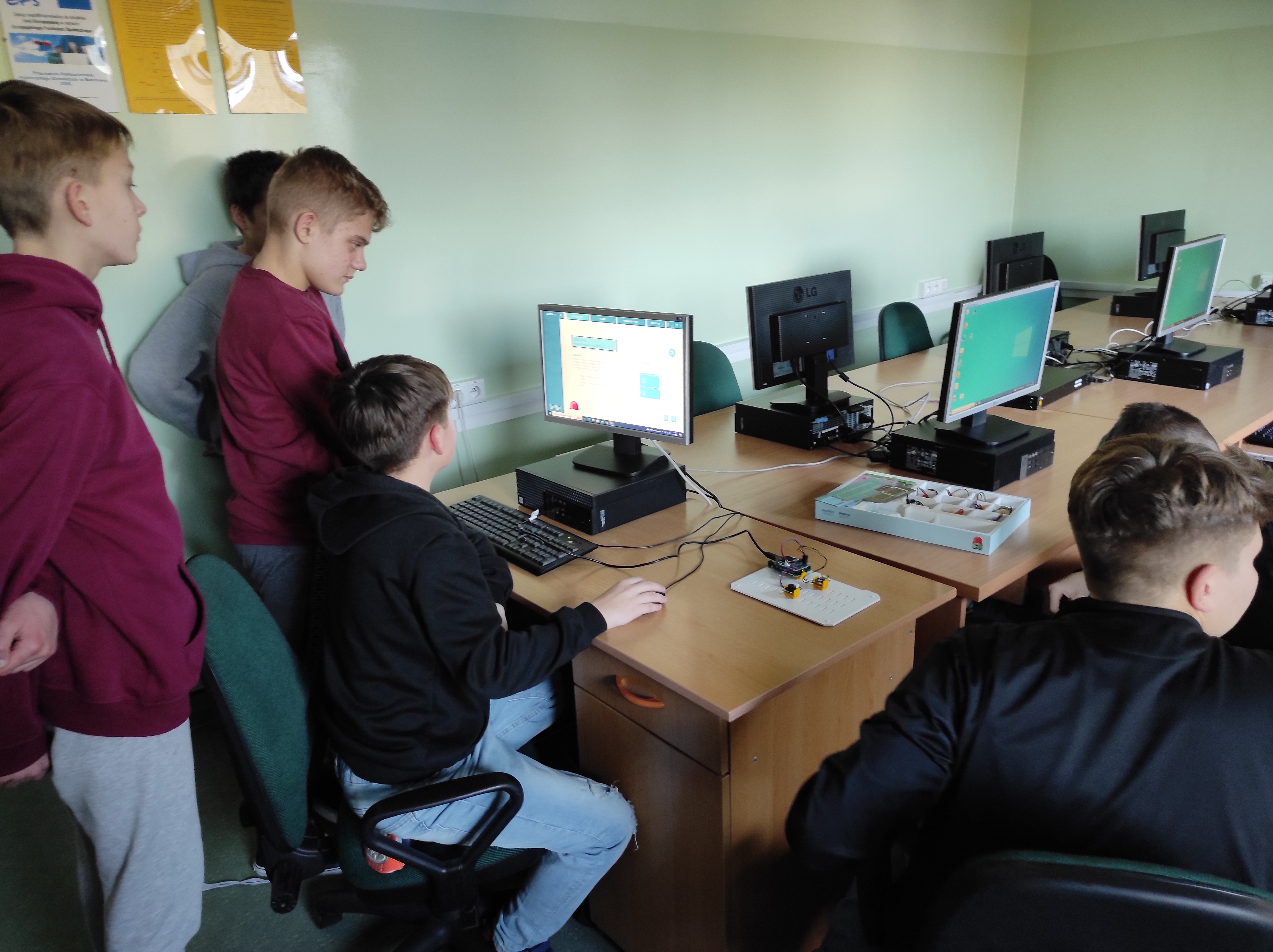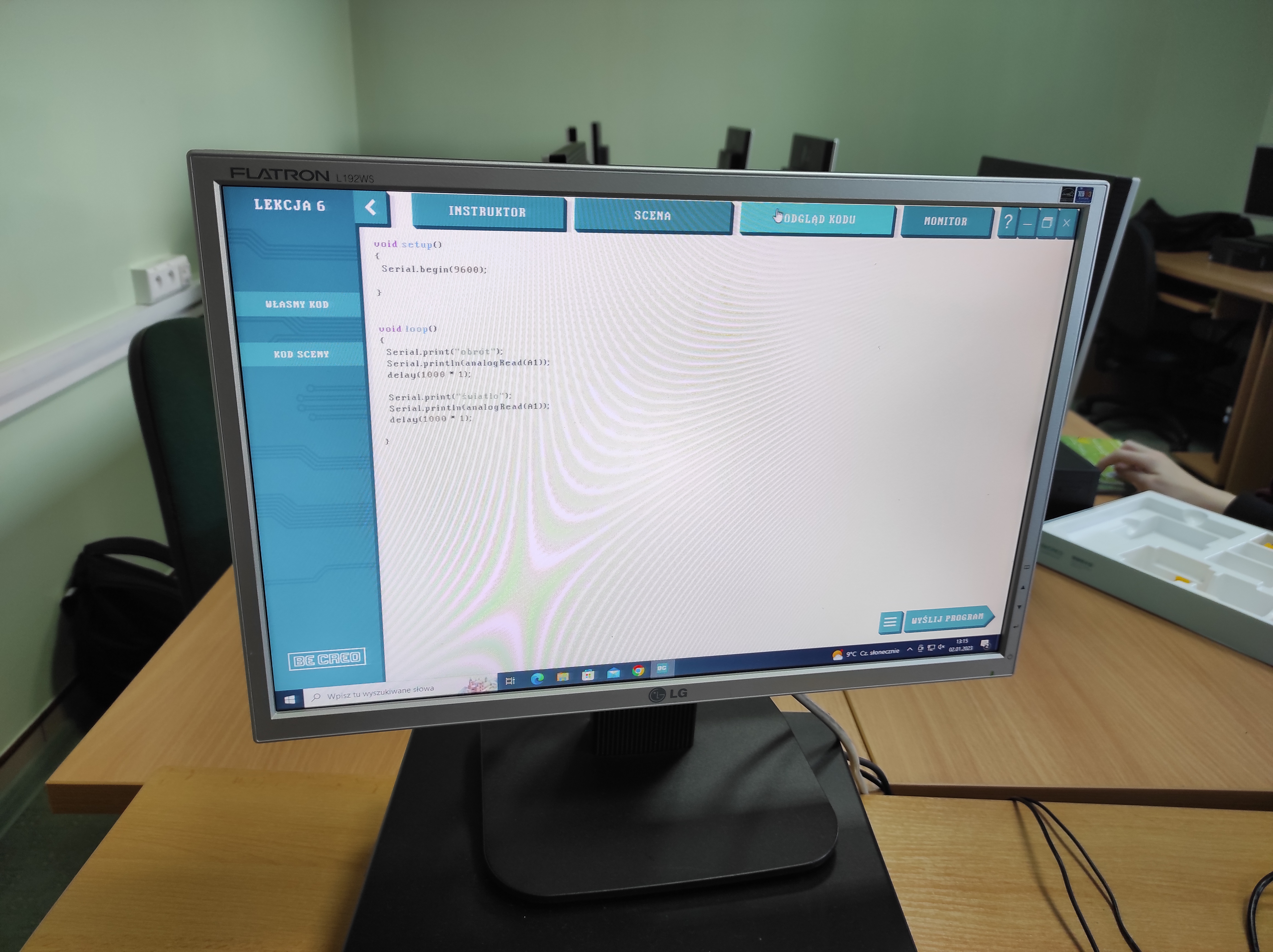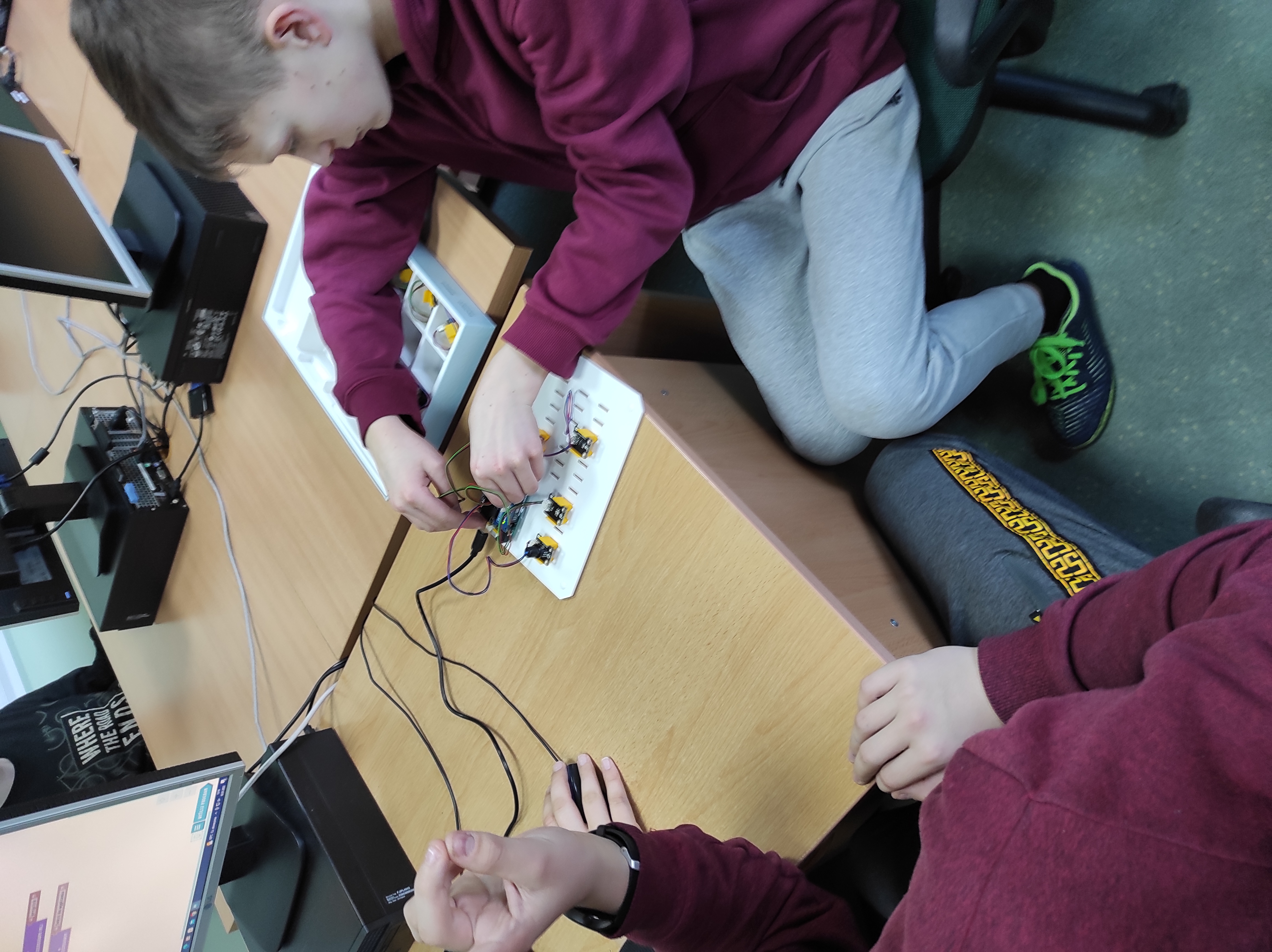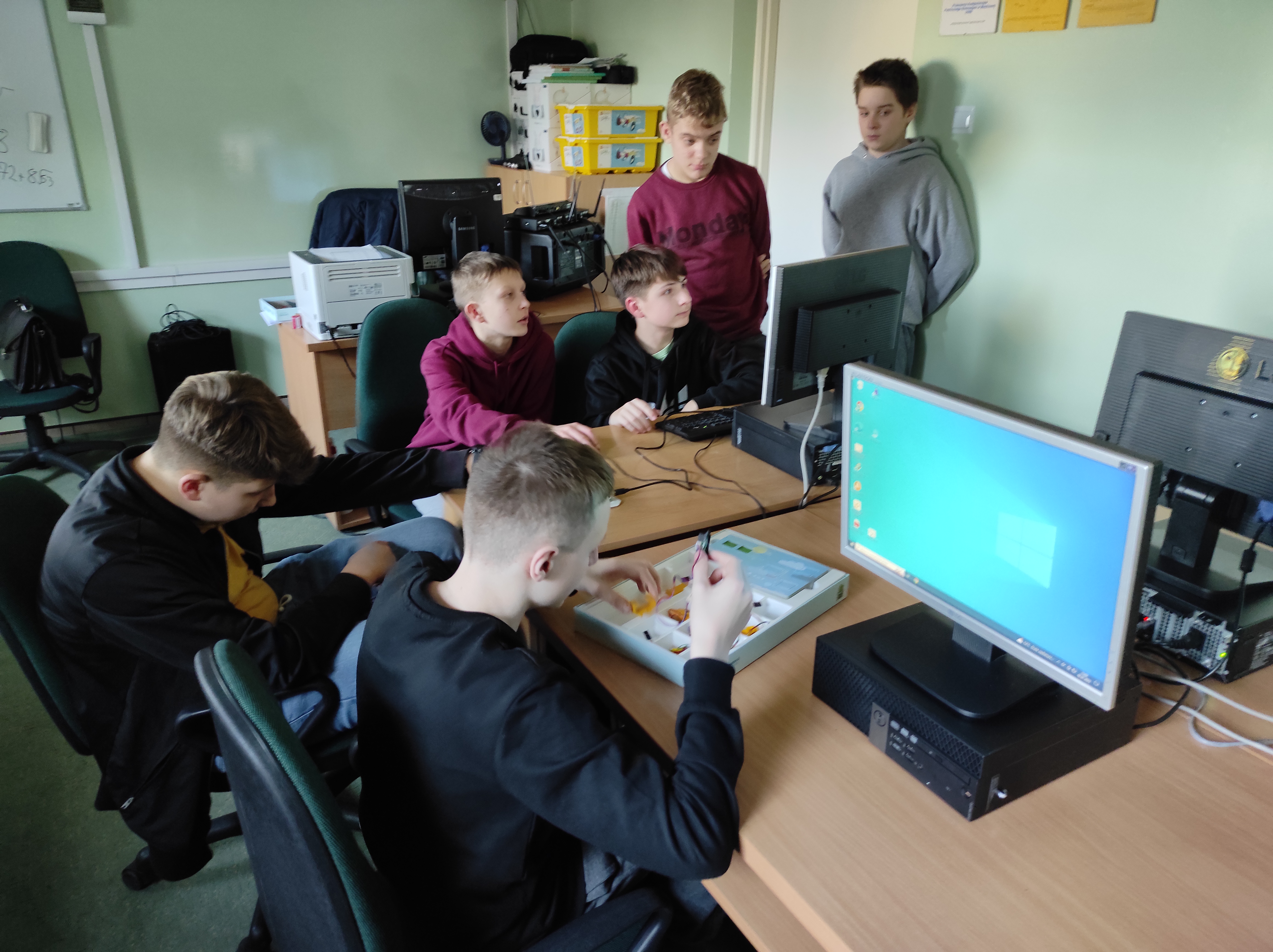 Dziś na zajęciach z programowania chłopcy z klasy szóstej wykorzystali sprzęt BeCreo – zestaw z mikrokontrolerem, który otrzymaliśmy w ramach projektu Laboratoria przyszłości. Laboratoria Przyszłości to inicjatywa edukacyjna realizowana przez Ministerstwo Edukacji i Nauki we współpracy z Centrum GovTech w Kancelarii Prezesa Rady Ministrów. Misją jest stworzenie nowoczesnej szkoły, w której zajęcia będą prowadzone w sposób ciekawy, angażujący uczniów oraz sprzyjający odkrywaniu ich talentów i rozwijaniu zainteresowań. Uczniowie rozpoczęli swoją przygodę z konstruowaniem i mechatroniką, połączyli ze wcześniejszą wiedzą zdobytą na lekcjach programowania, które już od kilku lat prowadzone są w naszej szkole przez Sławomira Króla – nauczyciela matematyki, informatyki – propagującego nauczanie programowania w naszej szkole. Na początku wybraliśmy projekt, wybraliśmy potrzebne moduły elektroniczne i czujniki, podłączyliśmy moduły, aby zbudować system rozwiązujący zadanie. Następnie napisaliśmy program, który kontrolował podłączone moduły i na koniec zostało wysłanie programu do mikrokontrolera i sprawdziliśmy, czy nasz projekt działa. Relacja z dzisiejszych zajęć na zdjęciach poniżej.