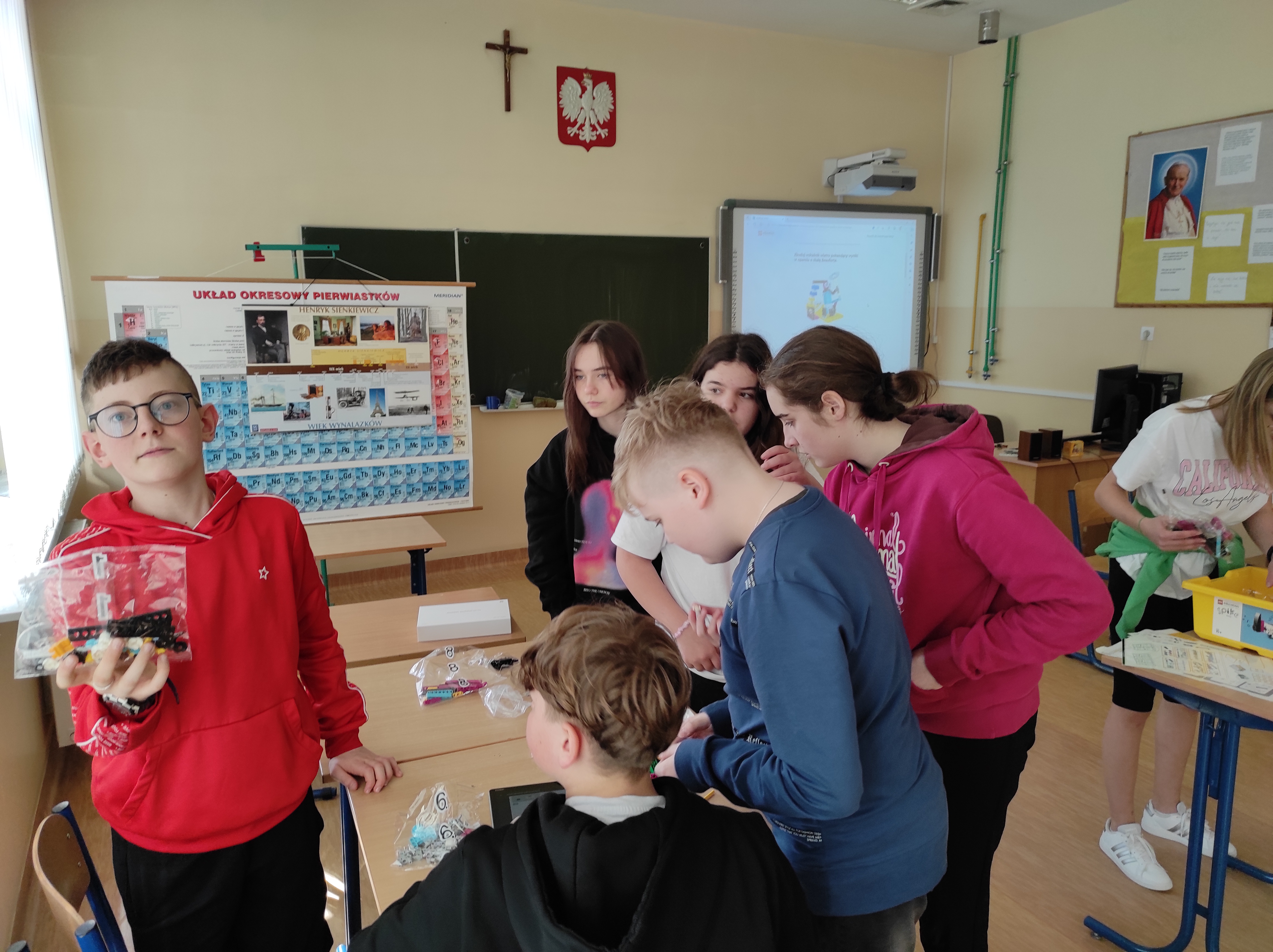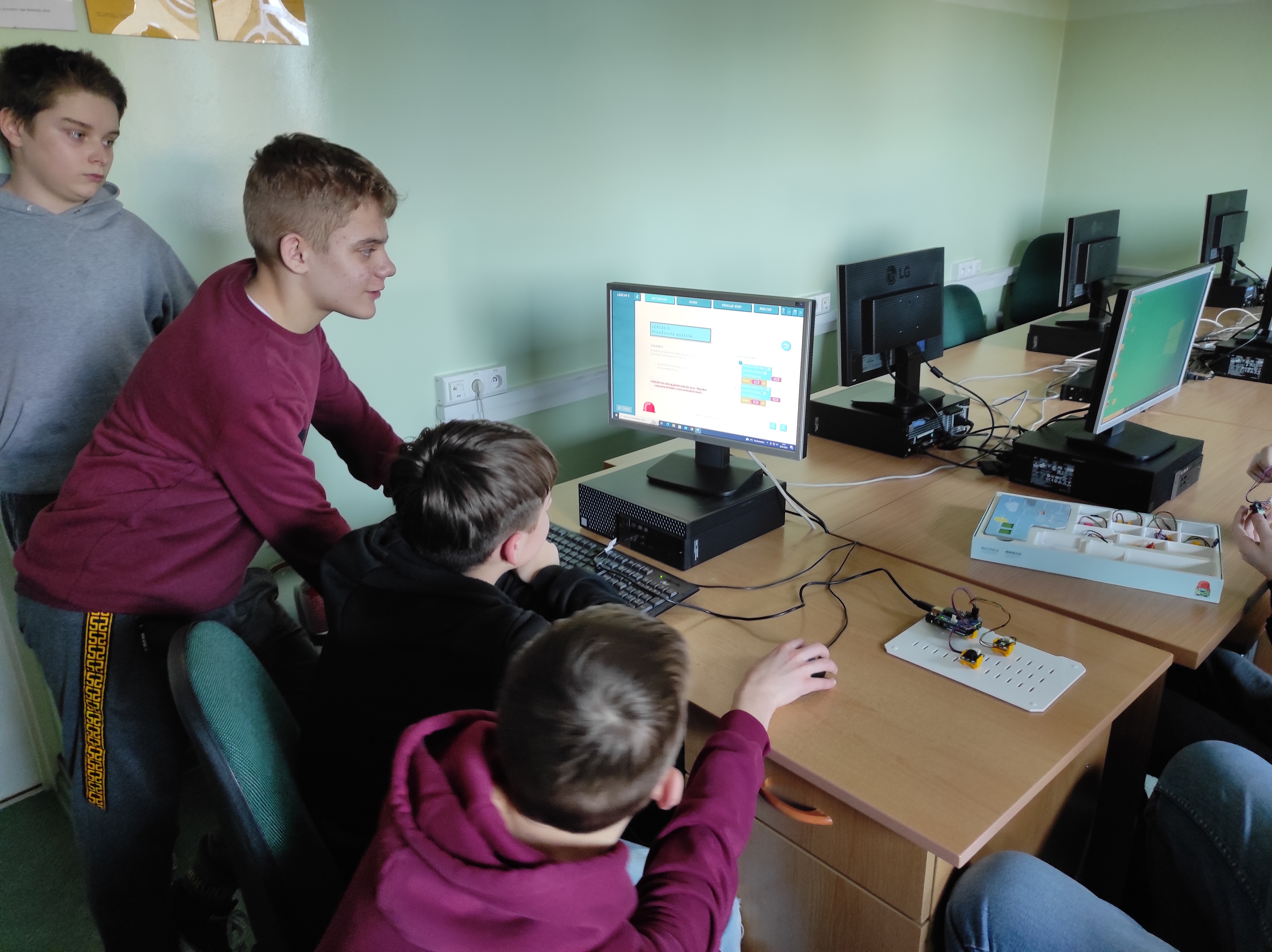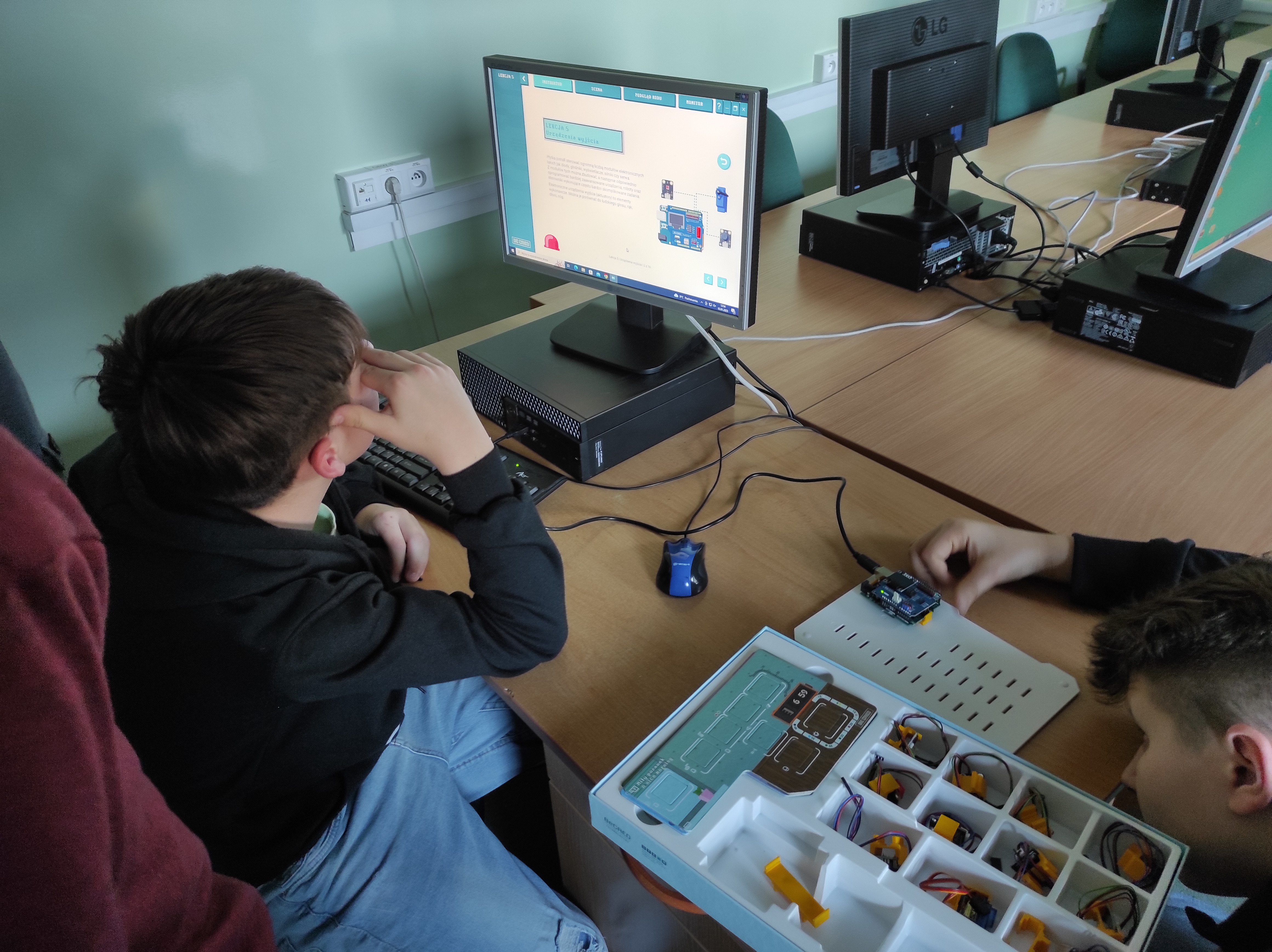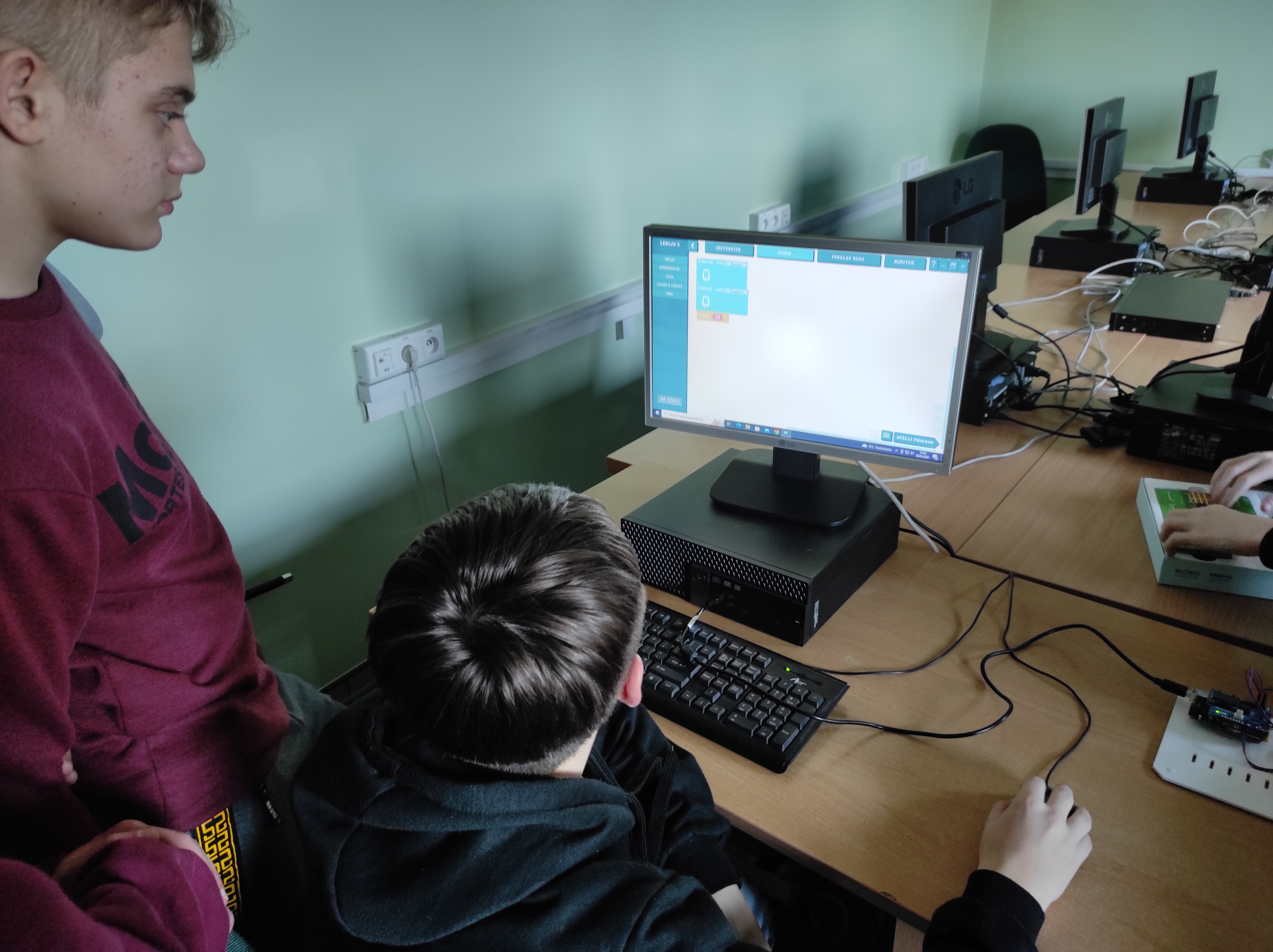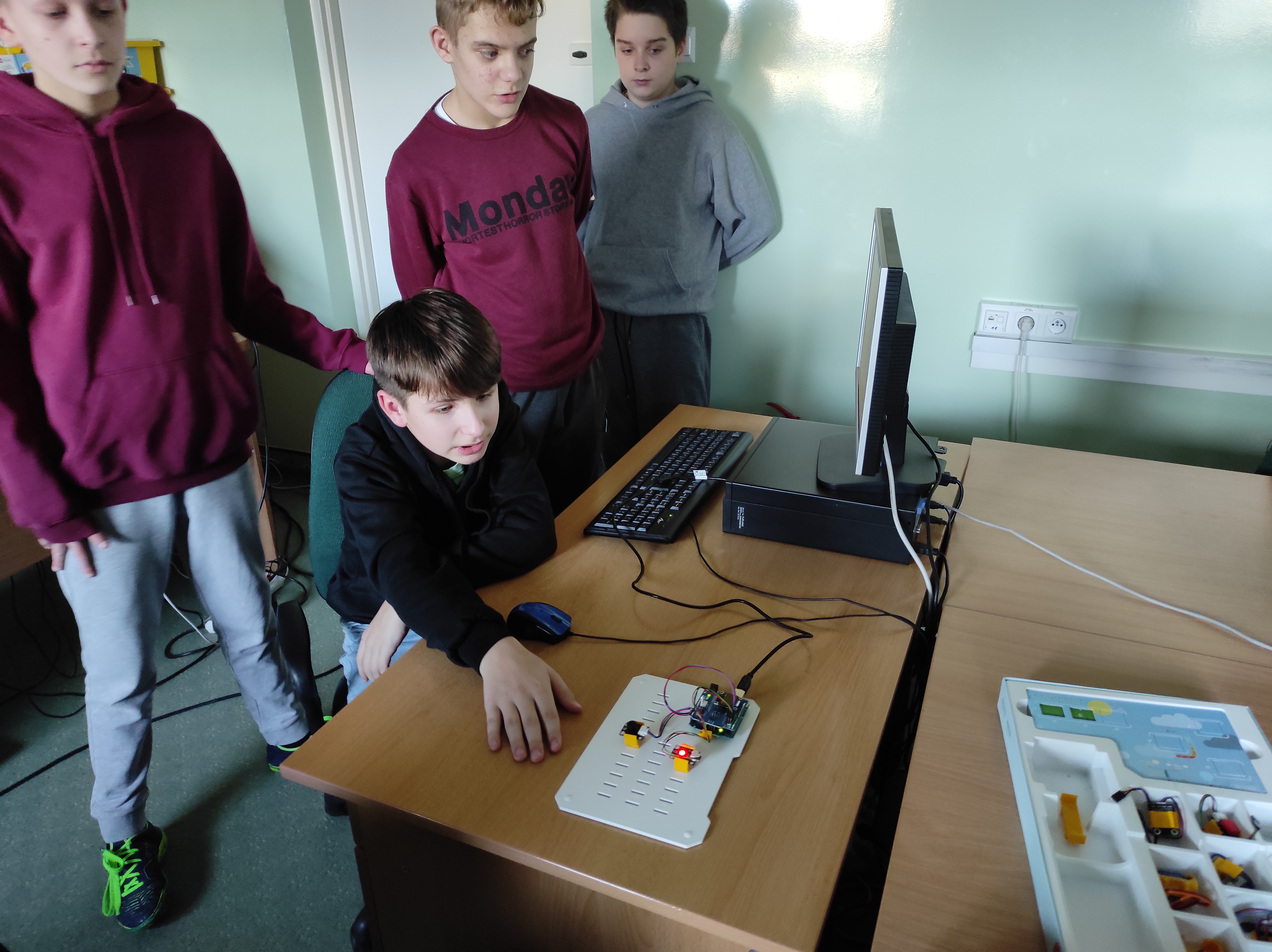 Dziś na zajęciach z programowania chłopcy z klasy szóstej wykorzystali sprzęt BeCreo – zestaw z mikrokontrolerem, który otrzymaliśmy w ramach projektu Laboratoria przyszłości. Laboratoria Przyszłości to inicjatywa edukacyjna realizowana przez Ministerstwo Edukacji i Nauki we współpracy z Centrum GovTech w Kancelarii Prezesa Rady Ministrów. Misją jest stworzenie nowoczesnej szkoły, w której zajęcia będą prowadzone w sposób ciekawy, angażujący uczniów oraz sprzyjający odkrywaniu ich talentów i rozwijaniu zainteresowań. Uczniowie rozpoczęli swoją przygodę z konstruowaniem i mechatroniką, połączyli ze wcześniejszą wiedzą zdobytą na lekcjach programowania, które już od kilku lat prowadzone są w naszej szkole przez Sławomira Króla – nauczyciela matematyki, informatyki – propagującego nauczanie programowania w naszej szkole. Na początku wybraliśmy projekt, wybraliśmy potrzebne moduły elektroniczne i czujniki, podłączyliśmy moduły, aby zbudować system rozwiązujący zadanie. Następnie napisaliśmy program, który kontrolował podłączone moduły i na koniec zostało wysłanie programu do mikrokontrolera i sprawdziliśmy, czy nasz projekt działa. Relacja z dzisiejszych zajęć na zdjęciach poniżej.