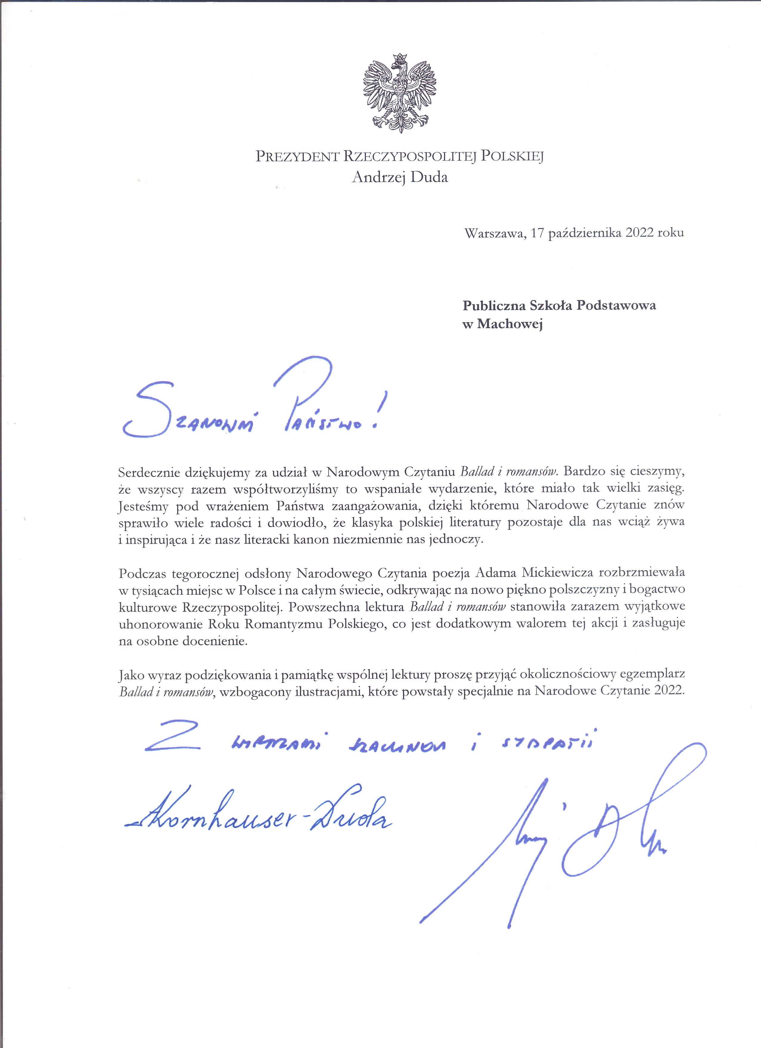 „Czucie i wiara silniej mówi do mnie, niż mędrca szkiełko i oko” Społeczność szkoły w Machowej po raz kolejny wzięła udział w odsłonie Narodowego Czytania. W tym roku czytaliśmy „Ballady i romanse” Adama Mickiewicza. W akcji wzięli udział wszyscy uczniowie klas V-VIII oraz nauczyciele. Zgromadzeni na szkolnym dziedzińcu pięknie przeczytaliśmy ballady: „Świteź”, „Panią Twardowską” i „ Romantyczność”. Tym samym uczciliśmy dwusetną rocznicę wydania dzieł Adama Mickiewicza.